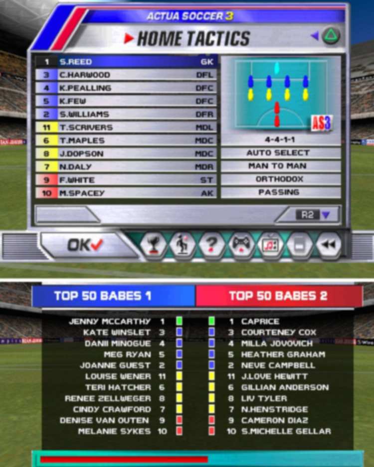 Accanto a questa apertura, Actua Soccer 3 nascondeva – letteralmente – qualcosa di molto diverso. Due squadre segrete chiamate Top 50 Babes, composte da attrici, modelle, showgirl e cantanti famosissime all’epoca. Non calciatrici, non atlete, ma icone pop selezionate esclusivamente per l’estetica. Le schermate parlano da sole: nomi celebri, valutazioni cromatiche, un’impostazione che oggi sarebbe difficilmente difendibile.